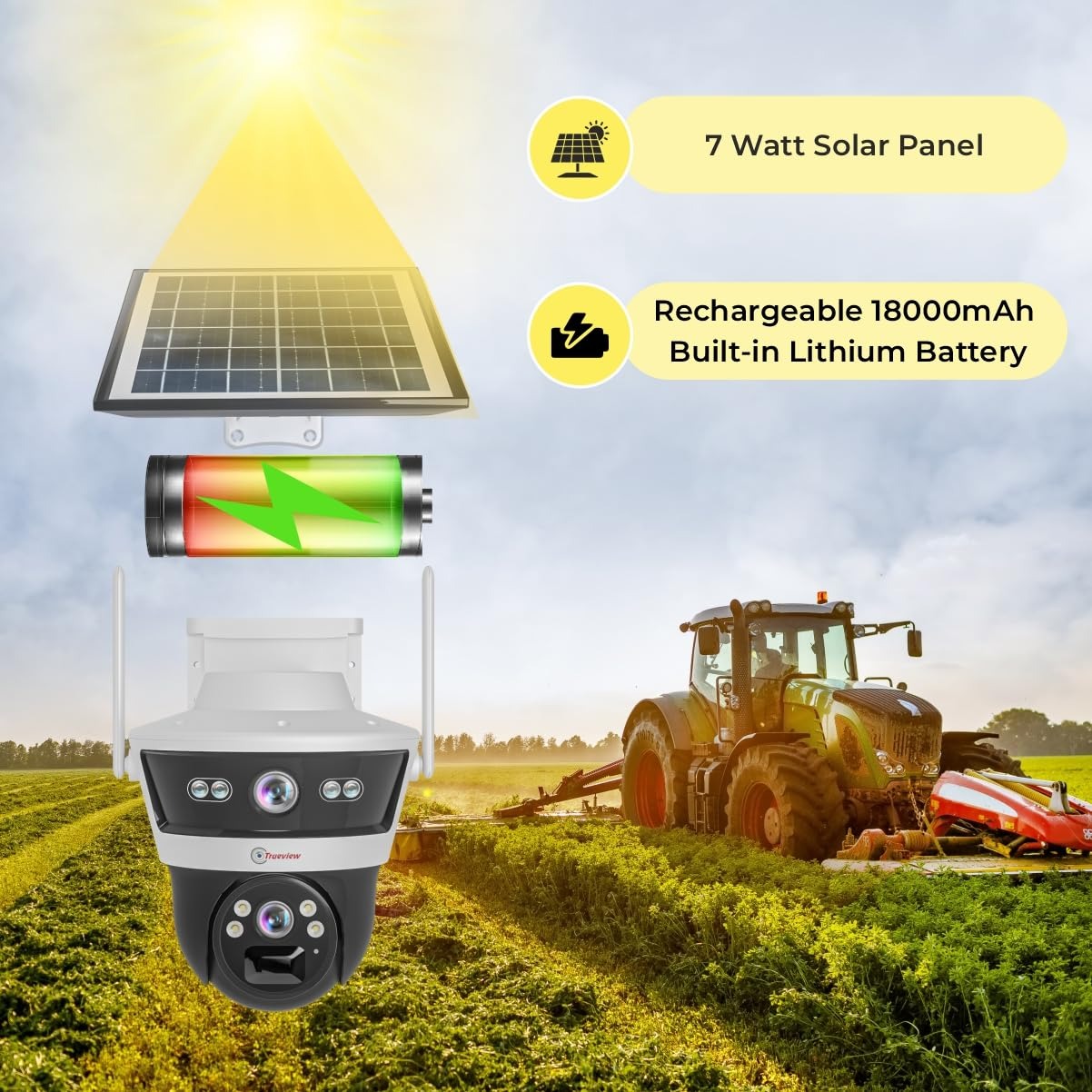 - Smart Dual Lens 4G Solar Pan/Tilt Camera • Horizontal rotation of 266 degrees, vertical rotation of 90 degrees • Built-in high-sensitivity MIC and speaker, support two-way audio • Built-in PIR Sensor • Built-In Battery 18000mAh, With 7W Solar Panel • Active defense Siren & Lights • Support Micro SD Card Up to 256GB & Cloud Storage (Optional) • 4G connection, scan the QR code to easily connect the camera • Area motion detection, Humanoid detection, push alarm information • Remote monitoring : PC/Mobile on TrueCloud • IP66 Waterproof Rating, 4000 Lightning Protection • Three ways to install : ceiling, wall, and pole mounting • 10X Combined Zoom • Compression : H.264/H.265/H.265+
